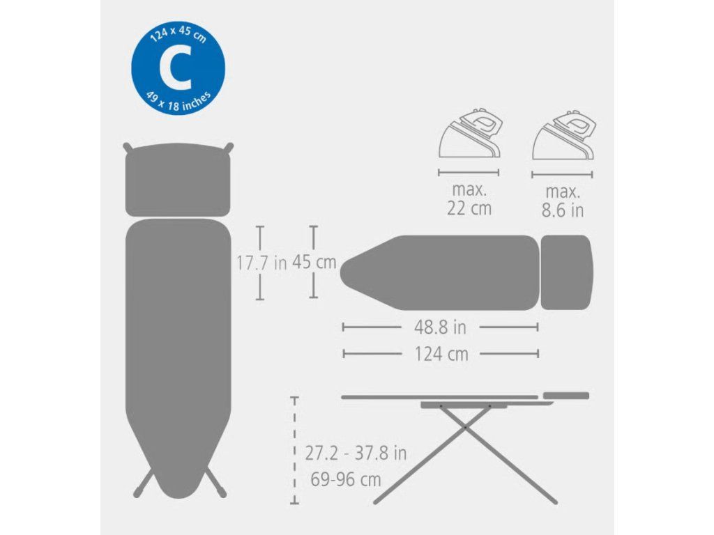 Táto extra veľká parná žehliaca doska Brabantia C s držiakom naparovacej jednotky vám poskytne 124 x 45 cm žehliaceho priestoru a ušetrí vám starosti s premiestňovaním bielizne po doske.