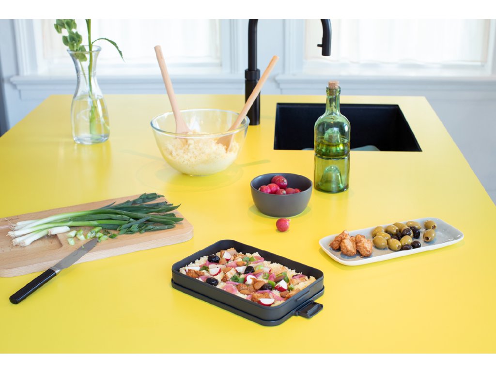 Tento plochý jedálenský box je vyrobený tak, aby sa zmestil do každej tašky alebo batohu.