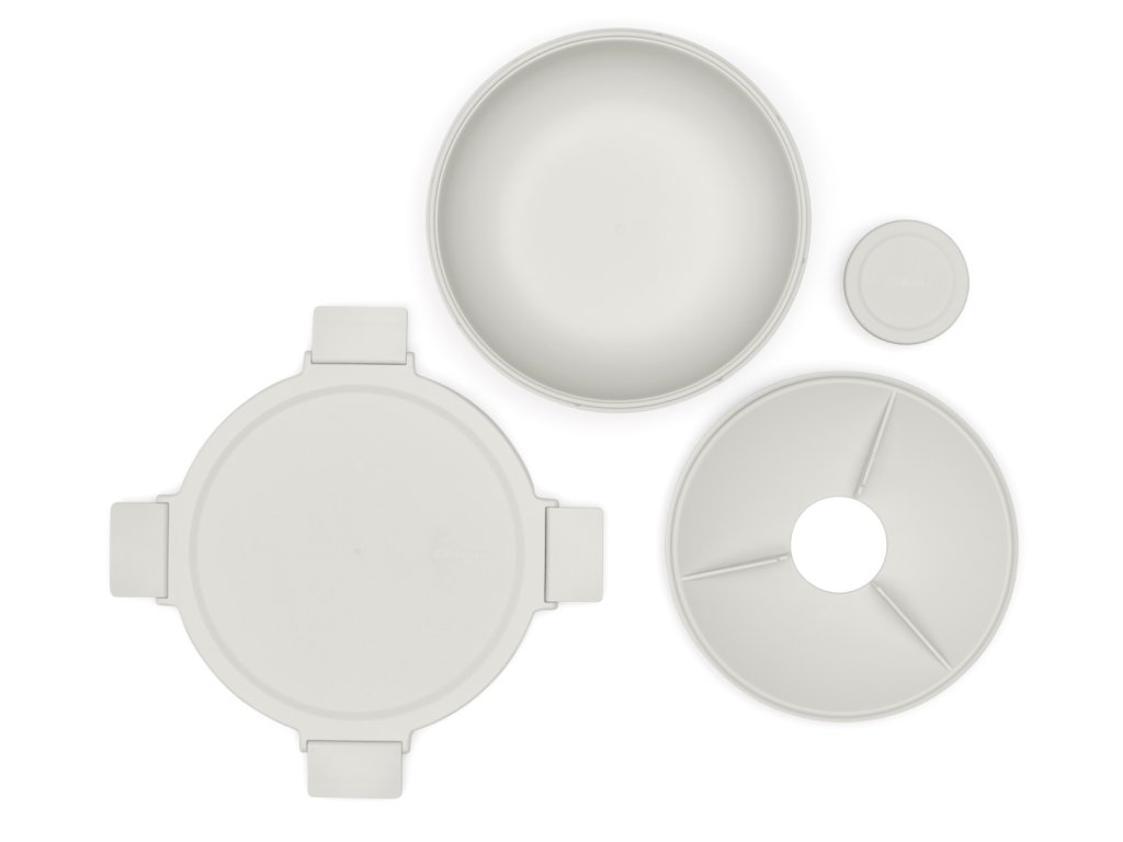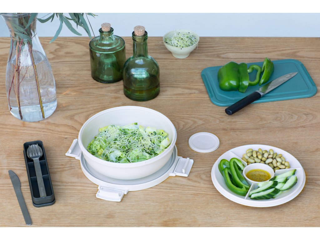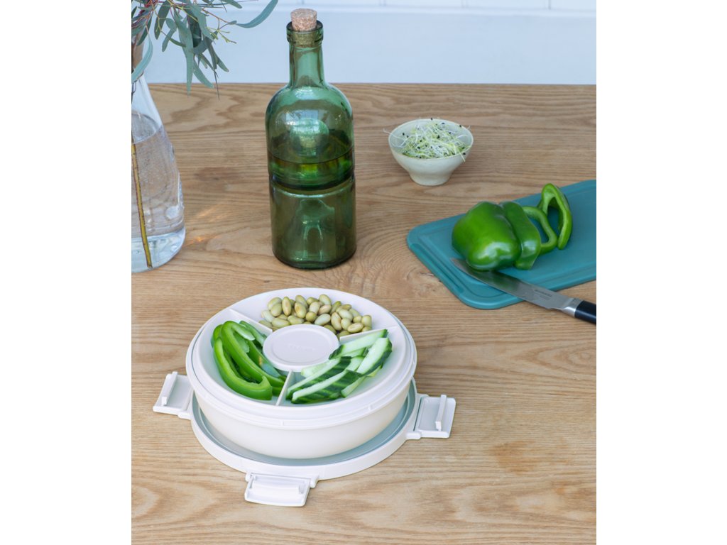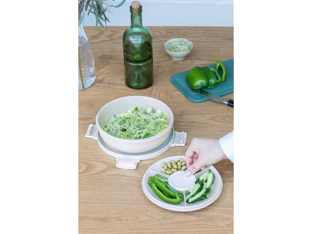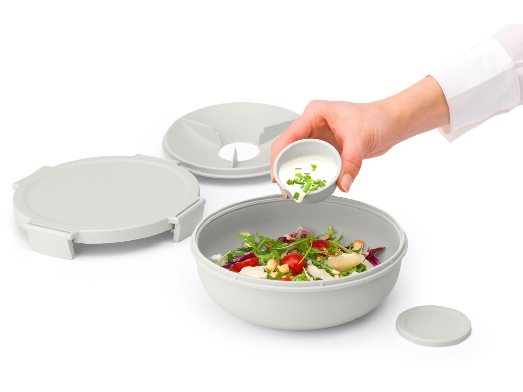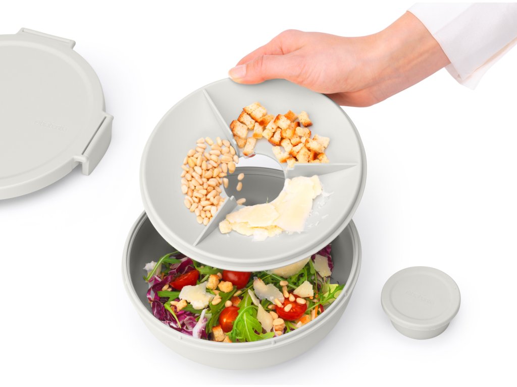 Táto super miska má priehradkovú vložku na polevy a nádobu na dresingy, ktorá slúži ako zátka. Vytiahnite nádobu a jemne zatraste miskou, aby sa polevy rozprestrelili, pridajte dresing a užívajte si.