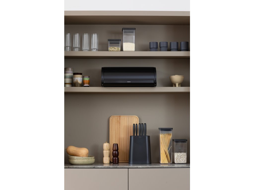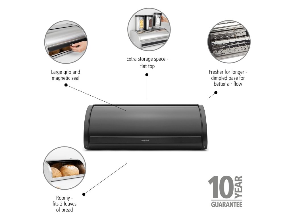 Tento chlebník pojme až dva bochníky chleba. Má veľké držadlo pre ľahké otváranie. Je tiež priestorovo úsporný: veko zmizne vo vnútri chlebníka. Praktický a štýlový doplnok do vašej kuchyne!