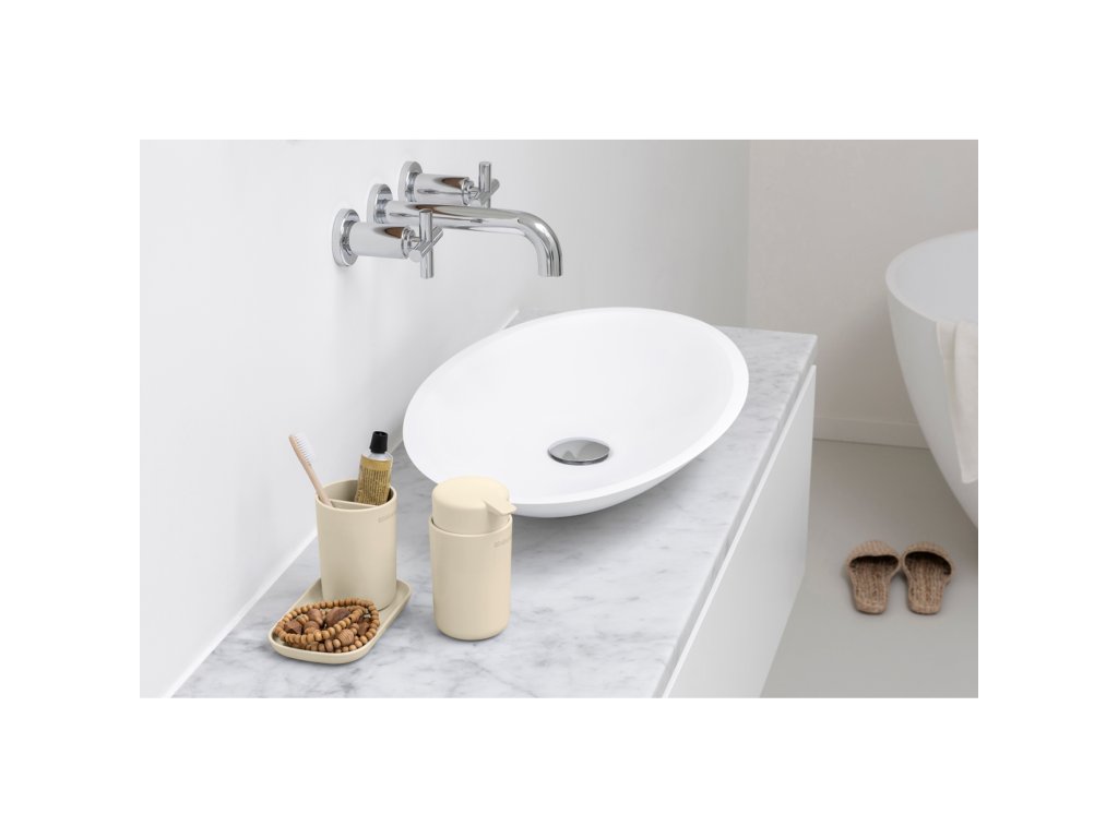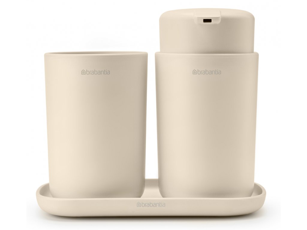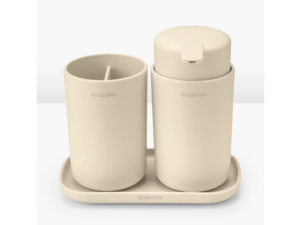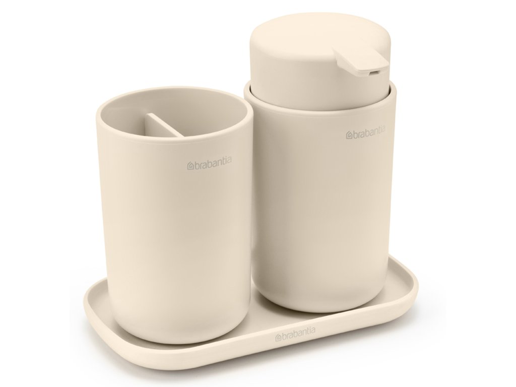 Praktická kúpeľňová sada - štýlové trio skladajúce sa z dávkovača mydla, držiaka zubnej kefky a podnosu.