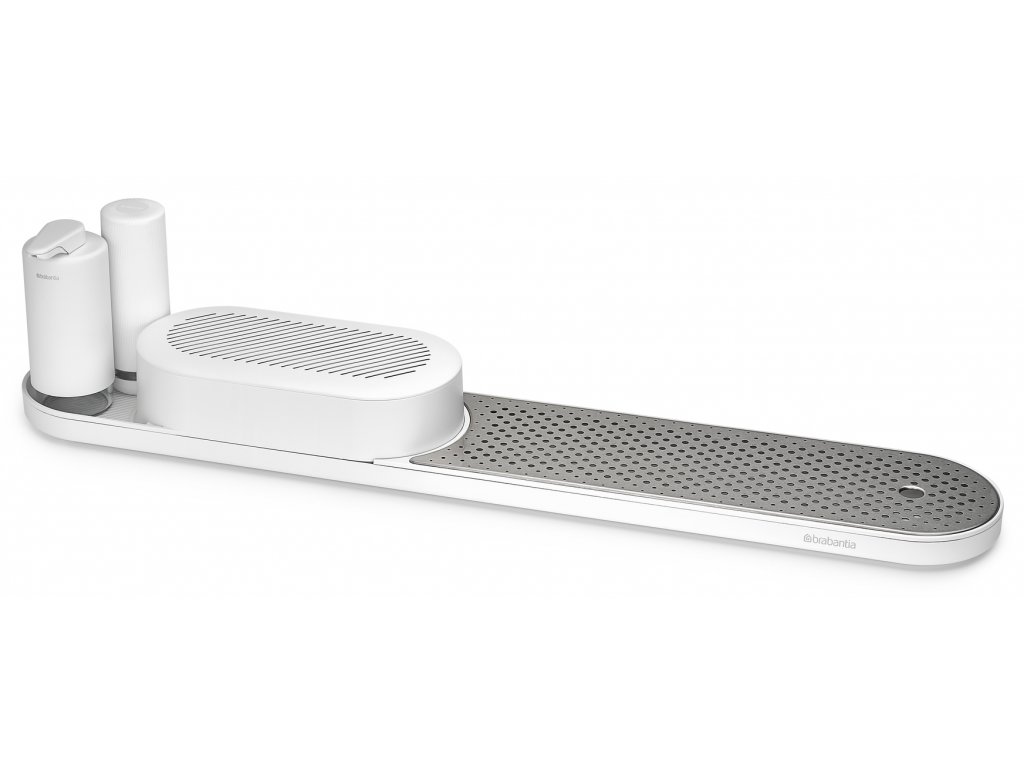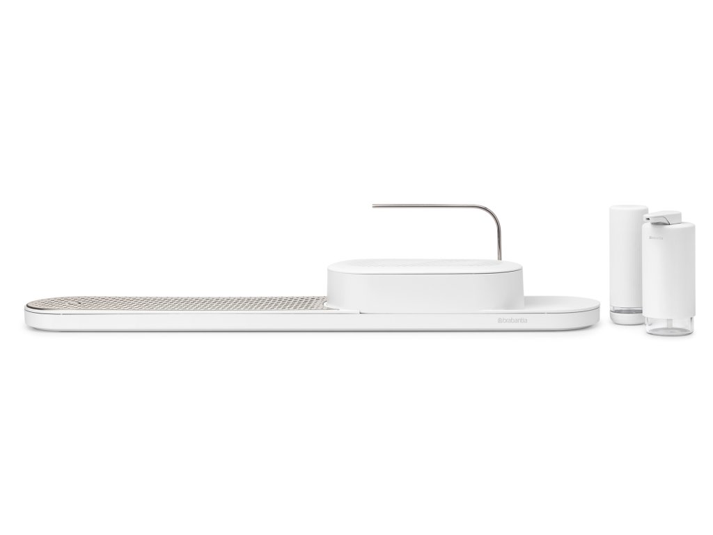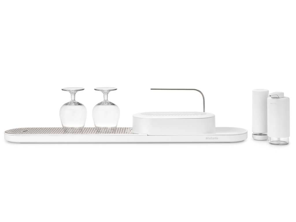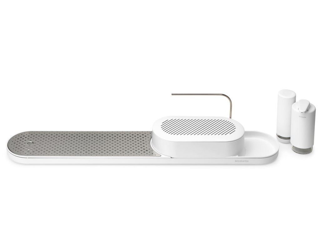 S týmto organizérom Brabantia SinkStyle, sušiakom, dávkovačom mydla a žmýkačom mydla. Tento elegantný pomocník na pracovnú dosku pojme všetko, čo potrebujete, aby ste mali na pracovnej doske poriadok a riad čistý – špeciálny box má dostatok miesta na schovanie hubiek, handričiek, kefky na riad a ďalších vecí.