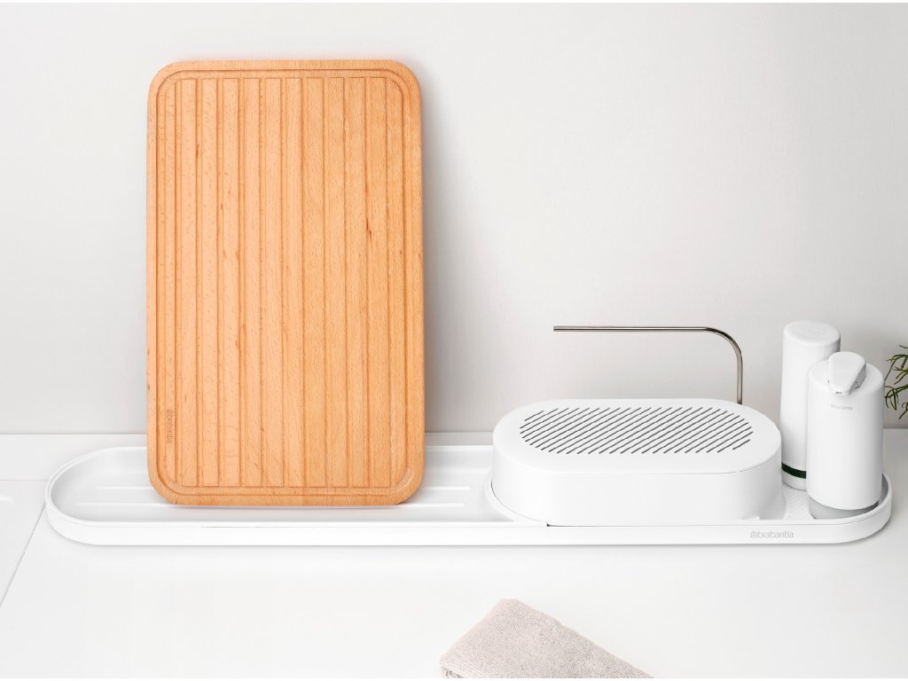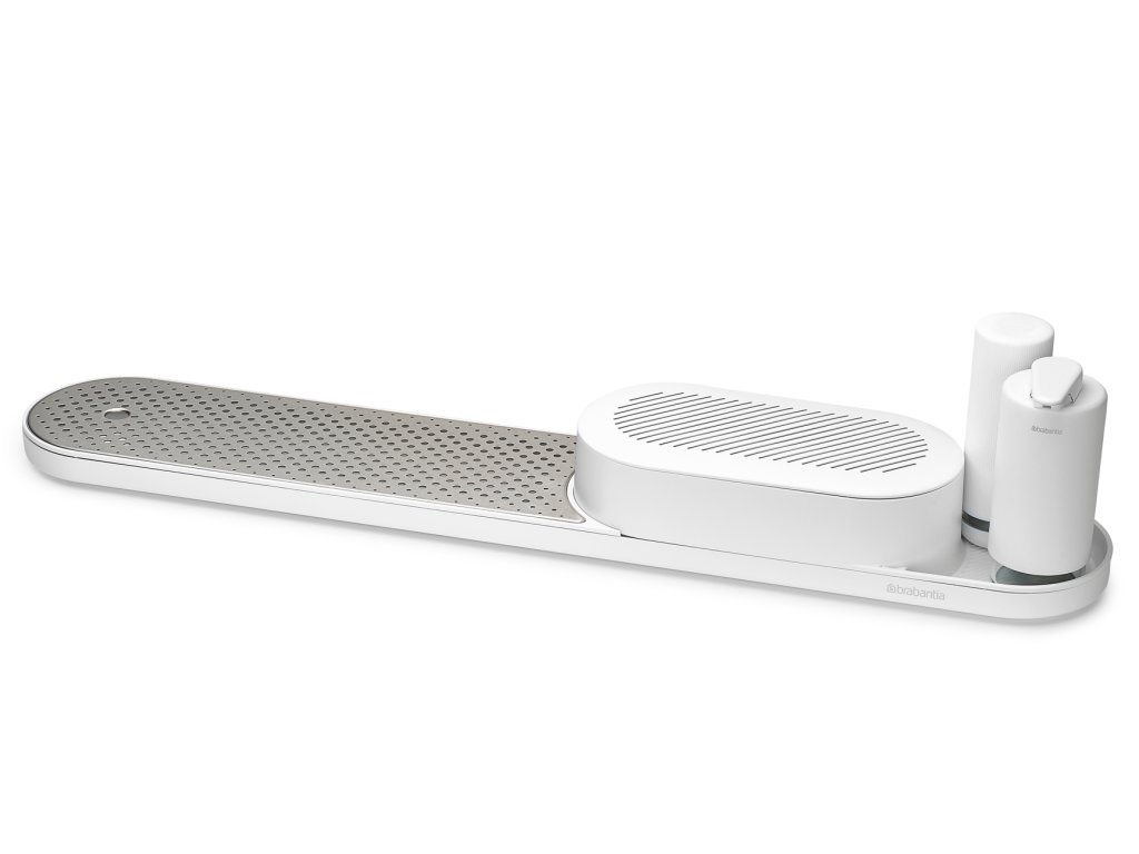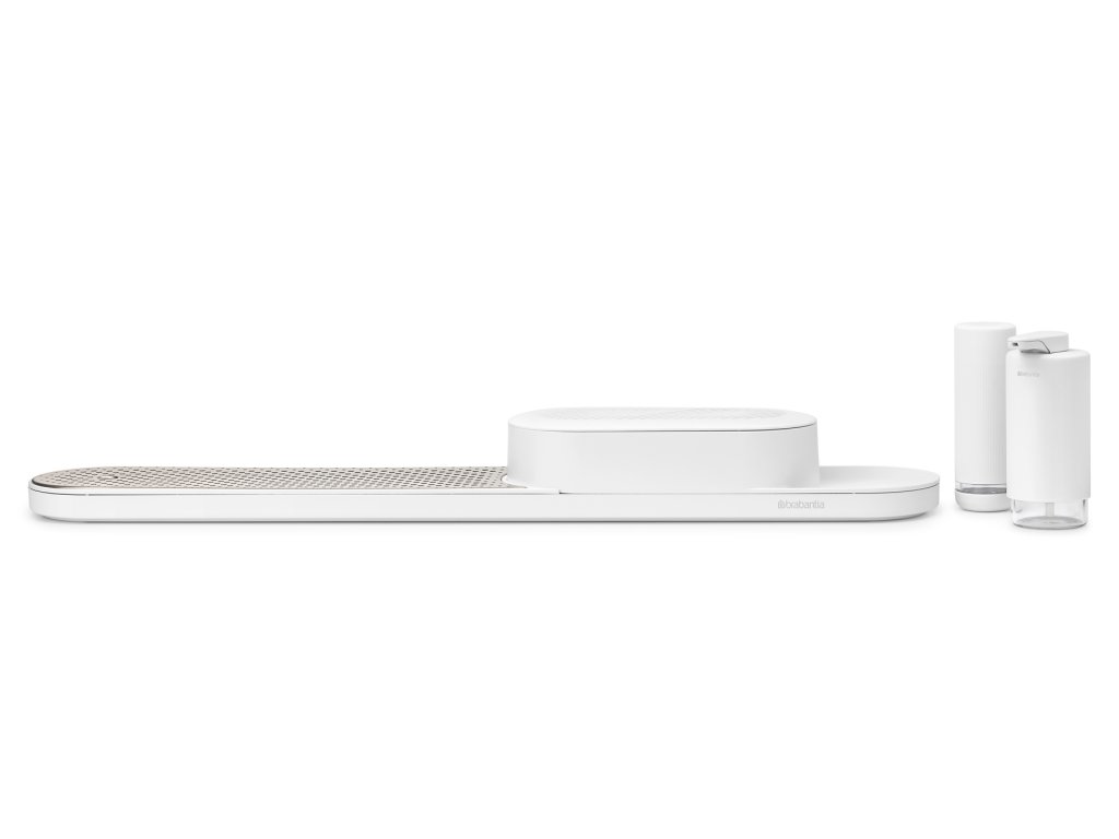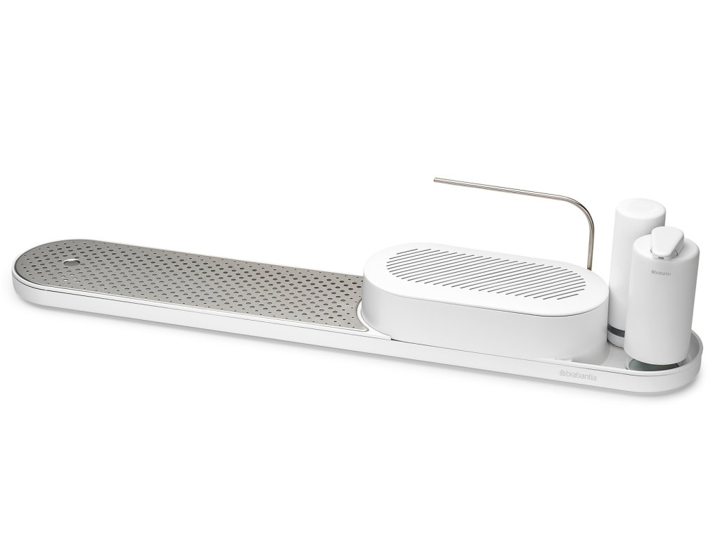 S týmto organizérom Brabantia SinkStyle, sušiakom, dávkovačom mydla a žmýkačom mydla. Tento elegantný pomocník na pracovnú dosku pojme všetko, čo potrebujete, aby ste mali na pracovnej doske poriadok a riad čistý – špeciálny box má dostatok miesta na schovanie hubiek, handričiek, kefky na riad a ďalších vecí.