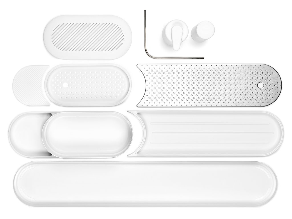 Odkvapkávacia miska vo vnútri umožňuje prúdenie vzduchu, čím sa predchádza nepríjemným zápachom. Môžete pridať sušiacu tyč na utierku na riad a samostatný zásobník udržuje organizér na mieste spolu s dávkovačom mydla a žmýkačom mydla. A je toho viac! Podnos má dokonca časť na sušenie riadu s odnímateľnou nerezovou doskou. Elegantné a štýlové!
