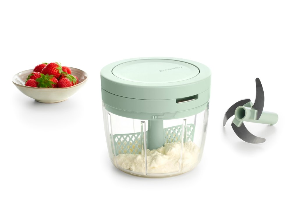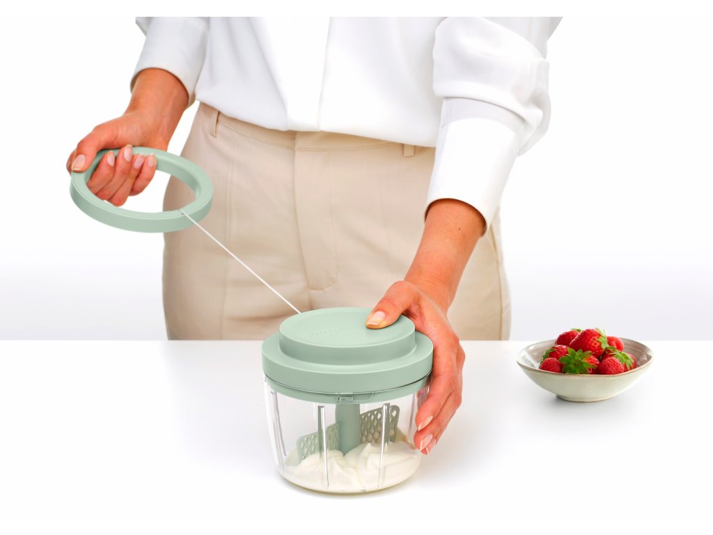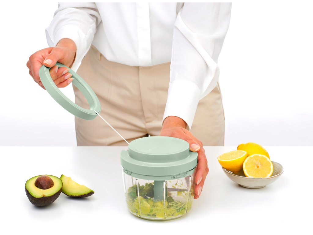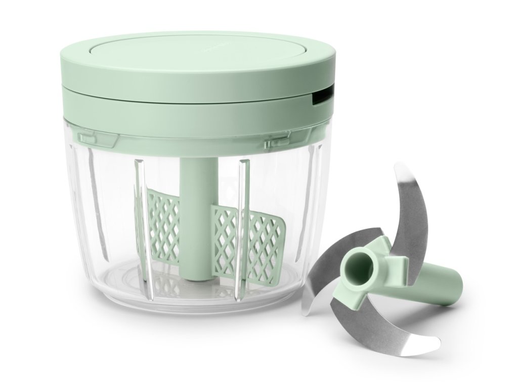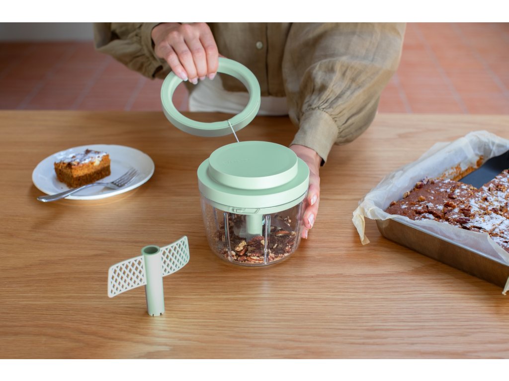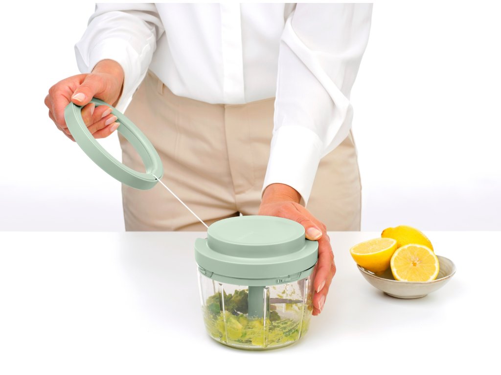Odhoďte nôž, ručný sekáčik Brabantia Tasty+ je vhodný na sekanie cibule, mrkvy alebo orechov! Tento ľahko použiteľný sekáčik má tri ostré čepele z nerezovej ocele, ktoré sa otáčajú, keď zatiahnete za krúžok, a ľahko prerežú aj tie najtvrdšie potraviny. Tento šikovný kuchynský pomocník má dokonca šľahací kotúč na šľahanie smotany, miešanie omáčok alebo šľahanie vajec behom okamihu. Kosiť, kosiť, hurá!