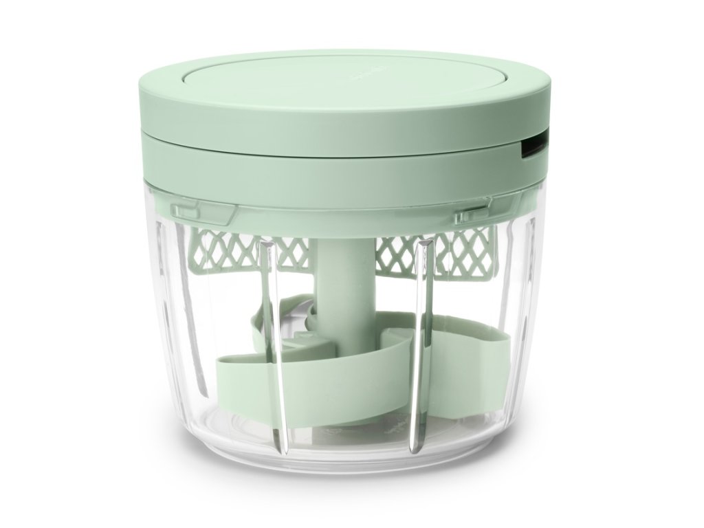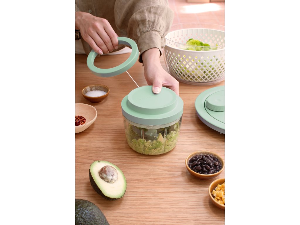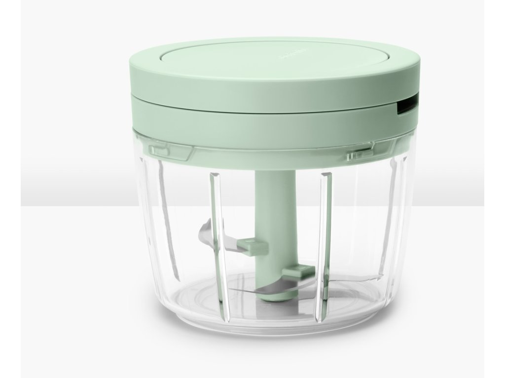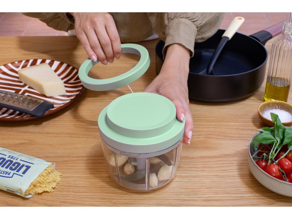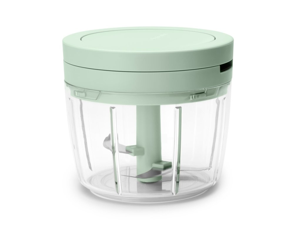 Odhoďte nôž, ručný sekáčik Brabantia Tasty+ je vhodný na sekanie cibule, mrkvy alebo orechov! Tento ľahko použiteľný sekáčik má tri ostré čepele z nerezovej ocele, ktoré sa otáčajú, keď zatiahnete za krúžok, a ľahko prerežú aj tie najtvrdšie potraviny. Tento šikovný kuchynský pomocník má dokonca šľahací kotúč na šľahanie smotany, miešanie omáčok alebo šľahanie vajec behom okamihu. Kosiť, kosiť, hurá!