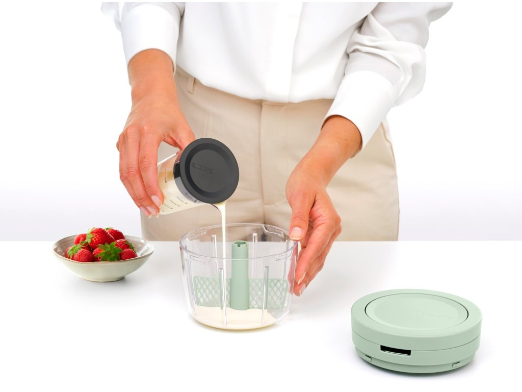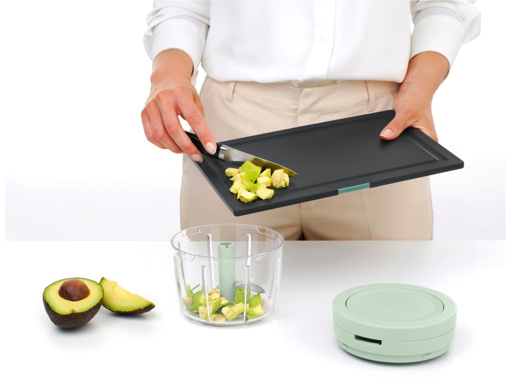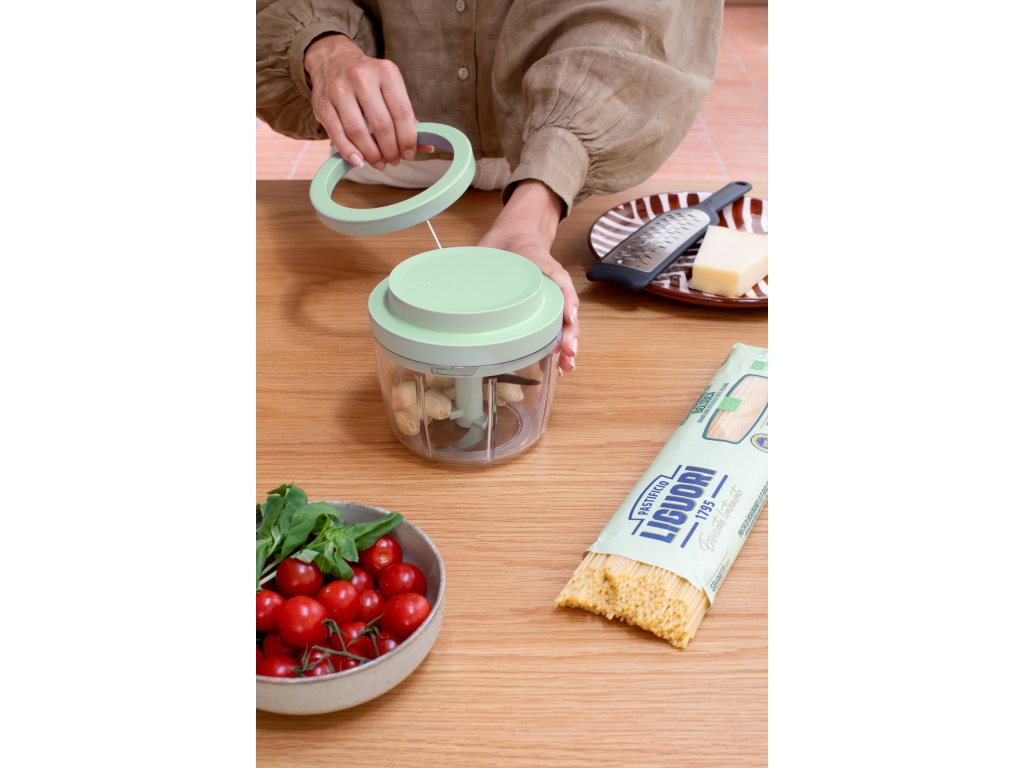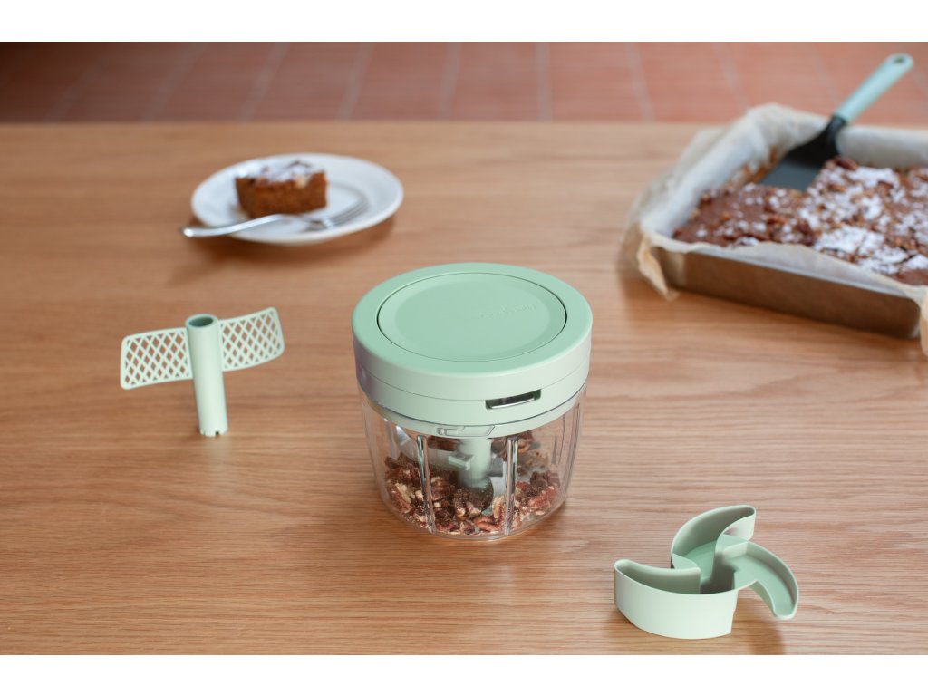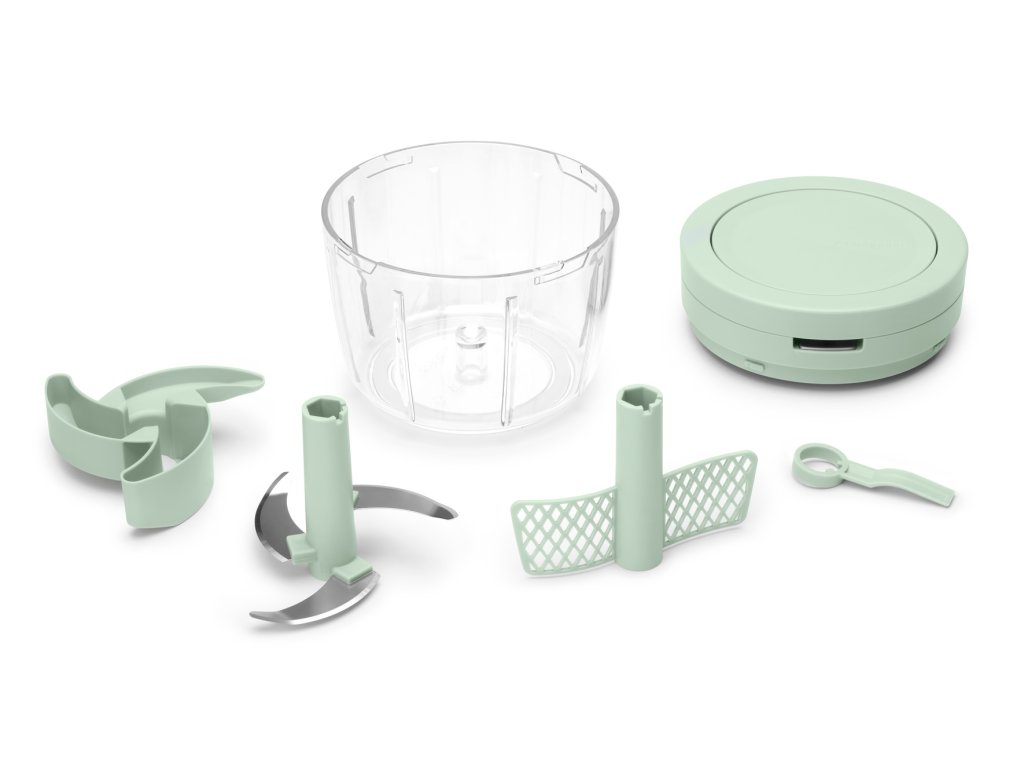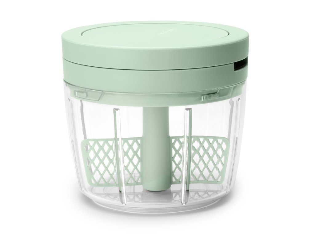 Odhoďte nôž, ručný sekáčik Brabantia Tasty+ je vhodný na sekanie cibule, mrkvy alebo orechov! Tento ľahko použiteľný sekáčik má tri ostré čepele z nerezovej ocele, ktoré sa otáčajú, keď zatiahnete za krúžok, a ľahko prerežú aj tie najtvrdšie potraviny. Tento šikovný kuchynský pomocník má dokonca šľahací kotúč na šľahanie smotany, miešanie omáčok alebo šľahanie vajec behom okamihu. Kosiť, kosiť, hurá!