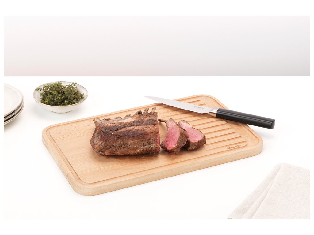 Sekacie doska na mäso má špeciálne drážky pre vypúšťanie štiav z mäsa.