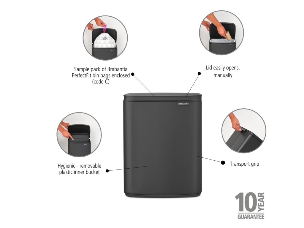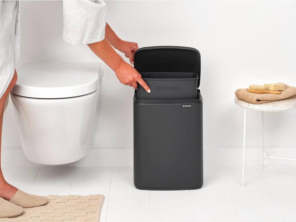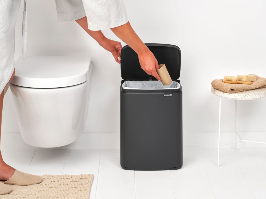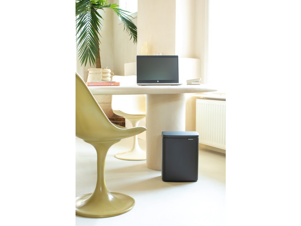 Odpadkový kôš Brabantia Bo s objemom 12 litrov je celkom praktický kôš. Unikátne veko sa ľahko zdvíha z ľavej, pravej aj prednej časti koša. Takže už nemusíte krútiť rukou, aby ste doň niečo vložili. Ďalšie plus: integrované úchyty pre ľahké premiestňovanie a vysypávanie. A vďaka svojej veľkosti a dizajnu sa tento kôš dobre vyníma v každej miestnosti. Bo ide!