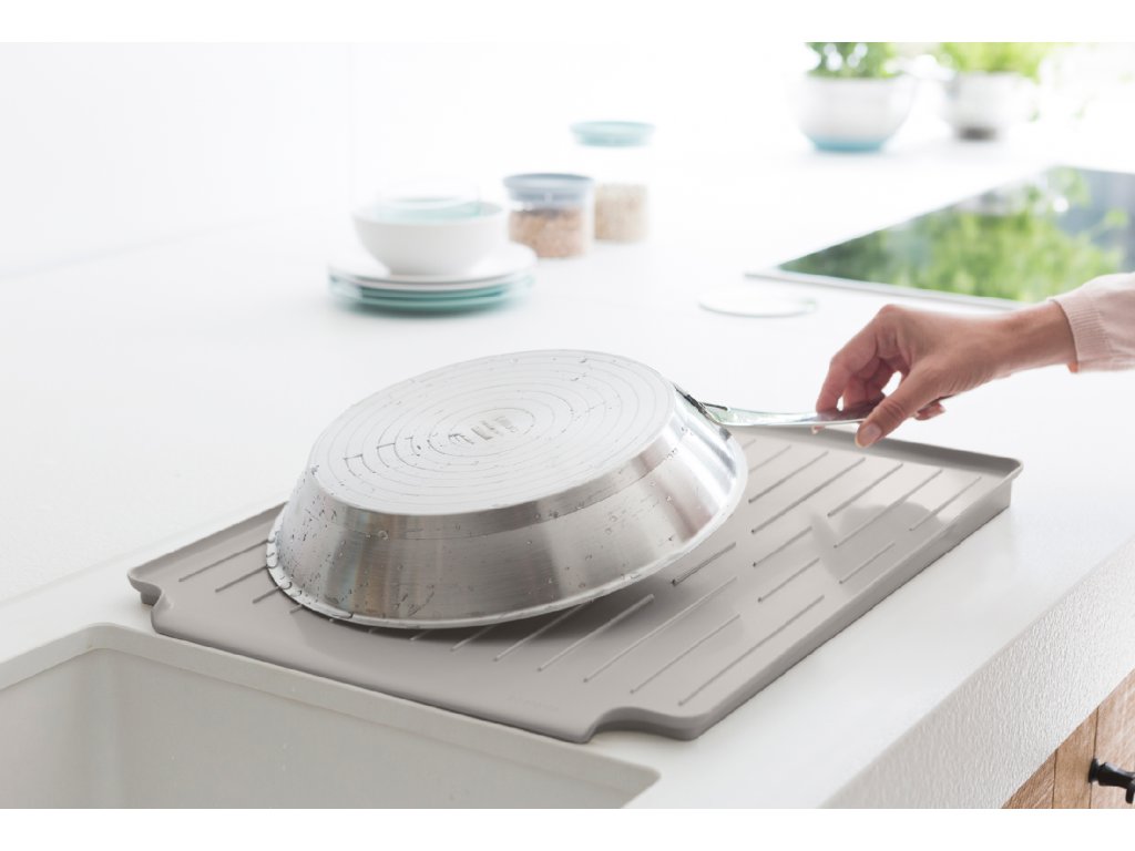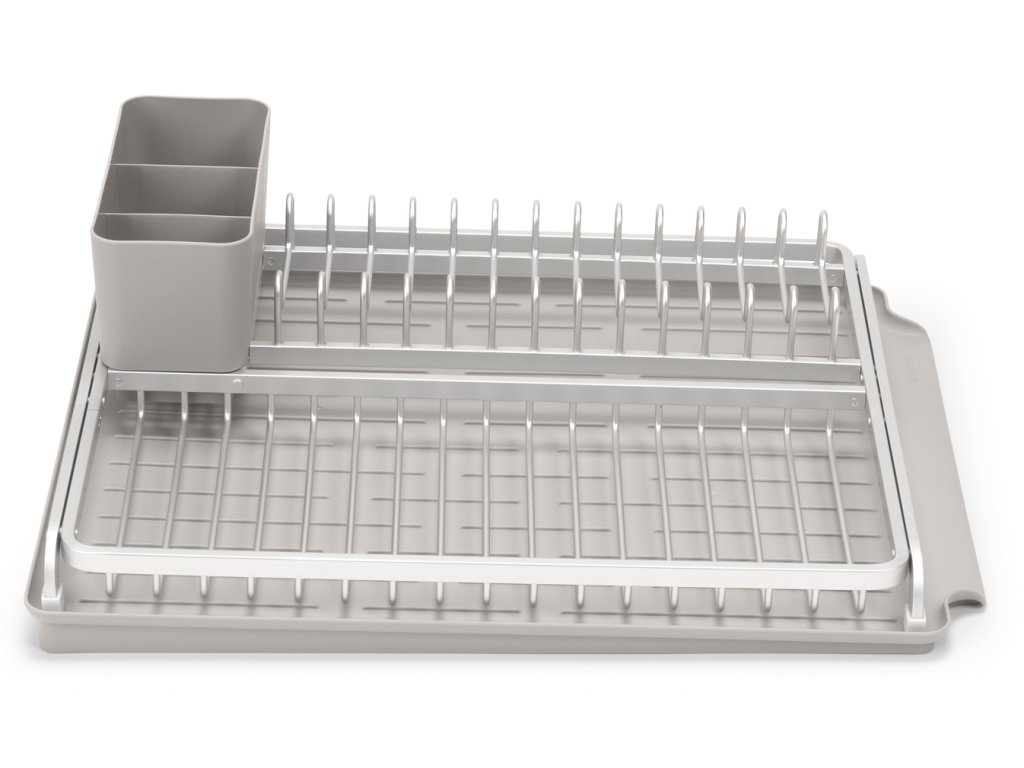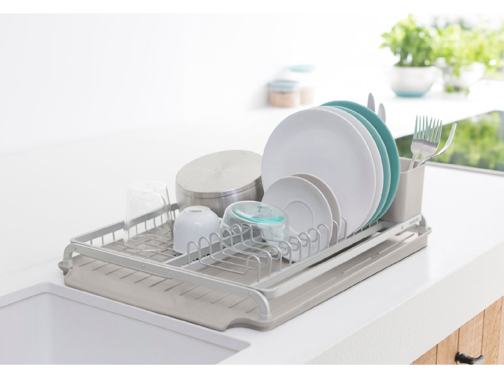 Tento odkvapkávač riadu Brabantia má elegantný dizajn a priestor až pre 13 tanierov plus misky, príbory a poháre. Má odnímateľný košík na príbory a tiež šikmú odkvapkávaciu misku, takže kvapky stekajú priamo do drezu.