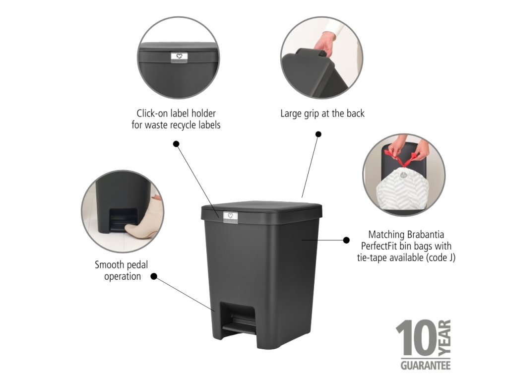 Zvýšte svoju recykláciu s pedálovým košom Brabantia StepUp 25L! Vyrobené z 91 % z recyklovaného odpadu a vyrobené na recykláciu odpadu. Pomalé zatváranie veka bez buchnutia. So zacvakávacím držiakom štítkov pre vaše vlastné odpadové štítky a praktickým uložením sáčkov vo vnútri koša. Pokiaľ milujete recykláciu, tento kôš si určite zamilujete.