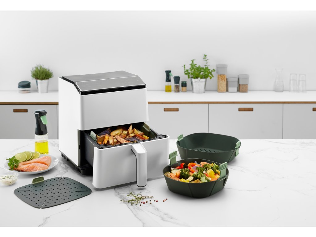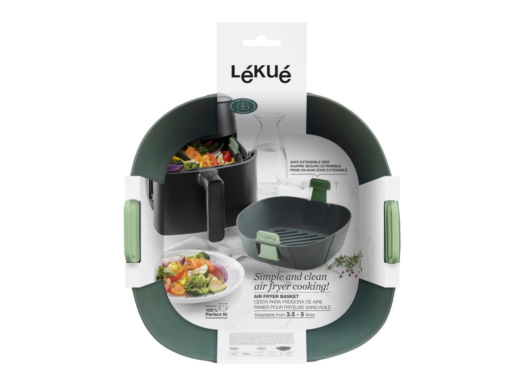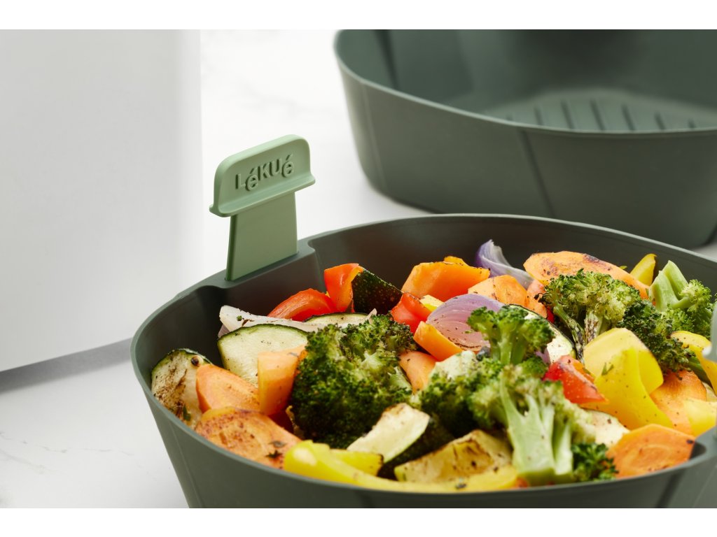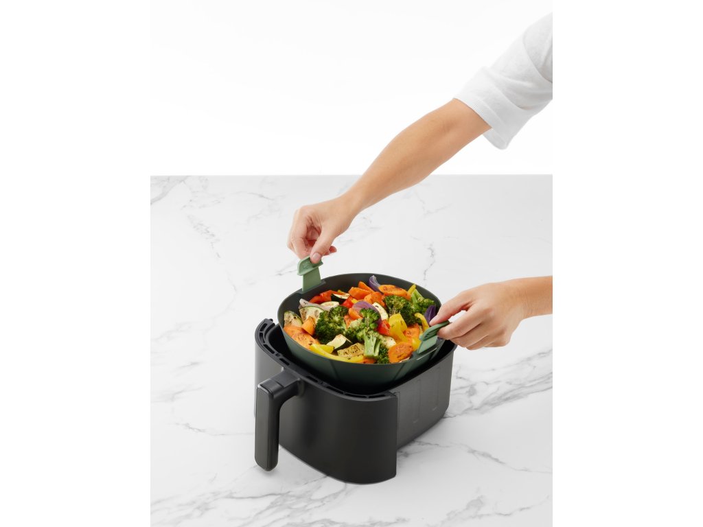 Vyrobené zo 100% silikónu. Bez BPA. Ideálne pre teplovzdušné fritézy s objemom od 5 l do 3,5 l. Nastaviteľné od 221 x 221 x 85 mm do 180 x 180 x 85 mm. Vždy používajte ochranné rukavice alebo handričku, aby ste úplne zabránili riziku popálenia.