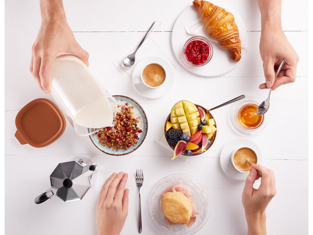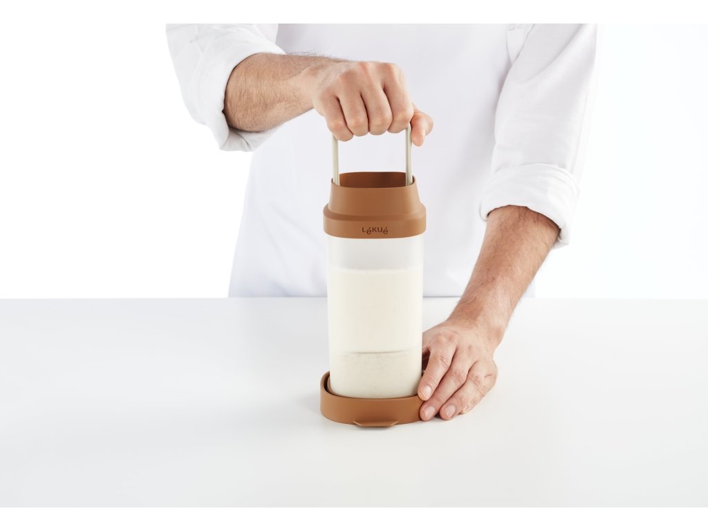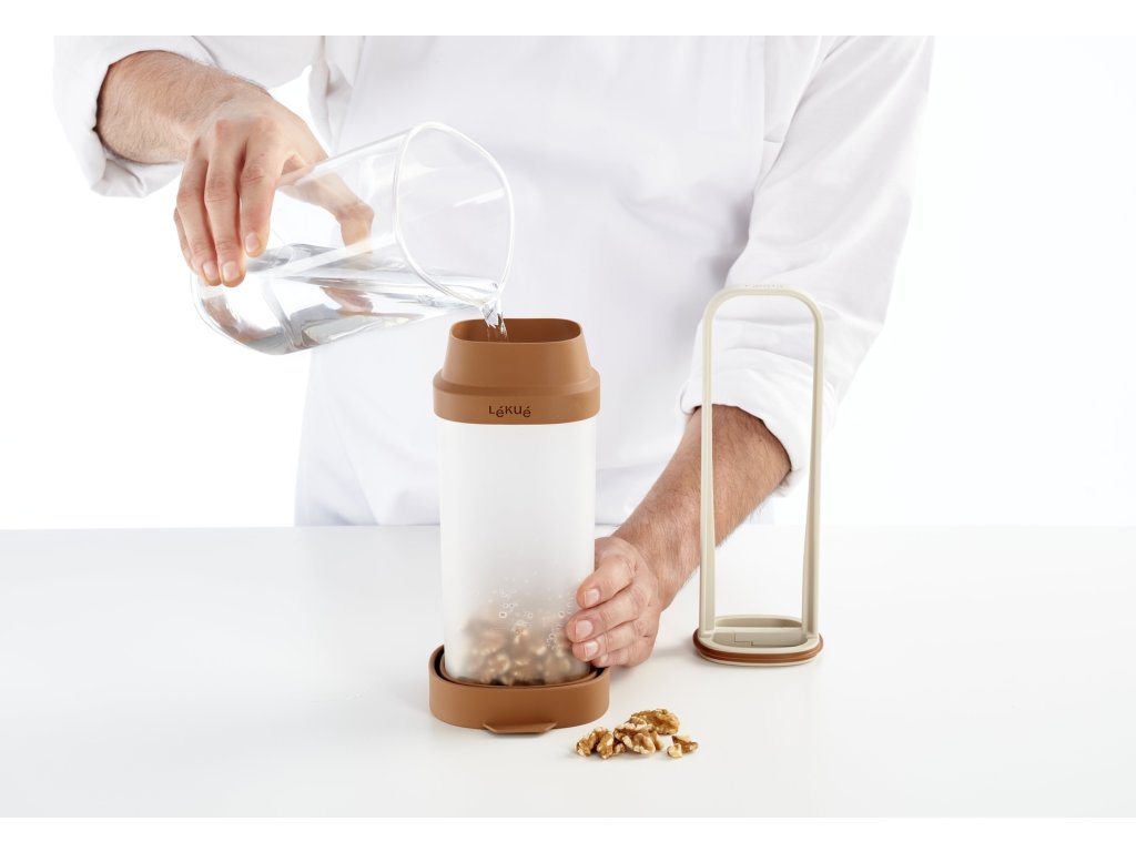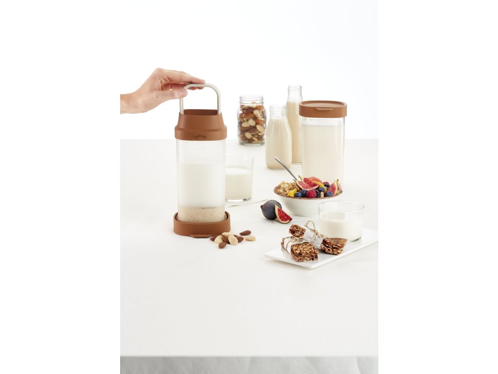 Produkt sa skladá z dvoch nádob s objemom 1 liter a ergonomického filtra. Vložte orechy, semienka alebo obilniny do vnútornej nádoby a prefiltrujte, namočte, nasekajte (bežným tyčovým mixérom pre domácnosť) a preceďte všetko v jednej nádobe. Vonkajšiu nádobu použite na uchovávanie v chladničke maximálne 3 dni.