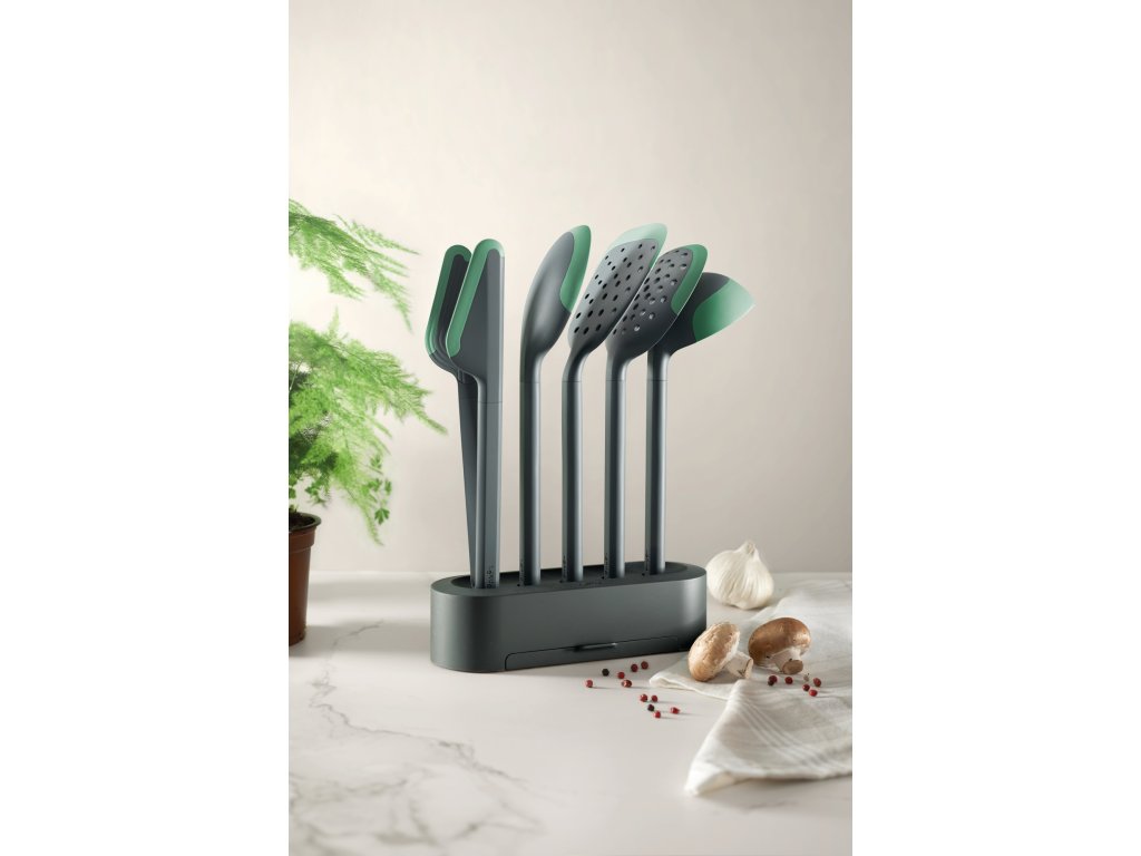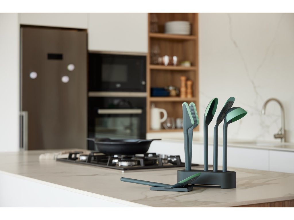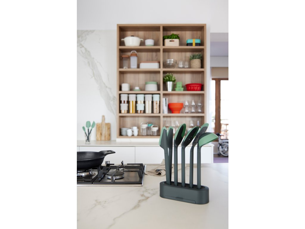 Navyše obsahuje exkluzívny držiak, ktorý je ideálny na udržanie vášho náčinia v poriadku a na očiach. Pripravené na rýchle a jednoduché varenie! Inovatívny dlhý a úzky tvar držiaka optimalizuje priestor na pracovnej doske a dobre využíva rohy alebo steny. Súčasťou je tiež podporná tácka na odloženie náčinia počas varenia, čím udržíte pracovnú dosku peknú a čistú. Praktický doplnok pre organizáciu kuchyne, ktorý sa stane súčasťou jej dekorácie.