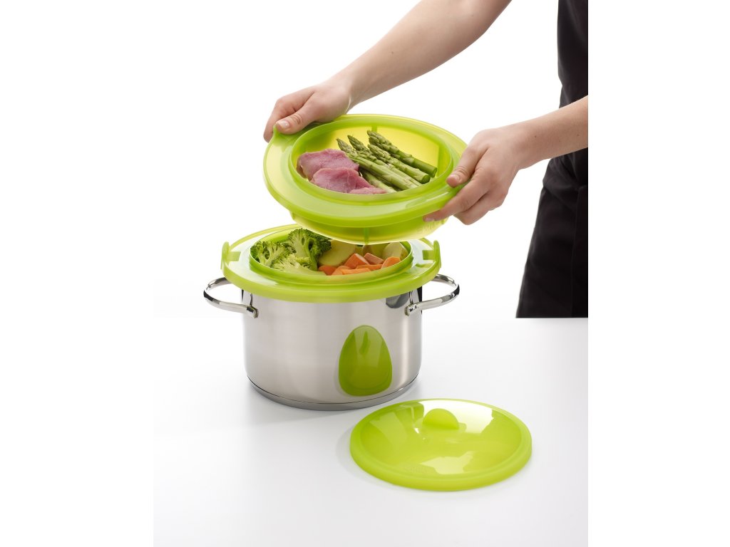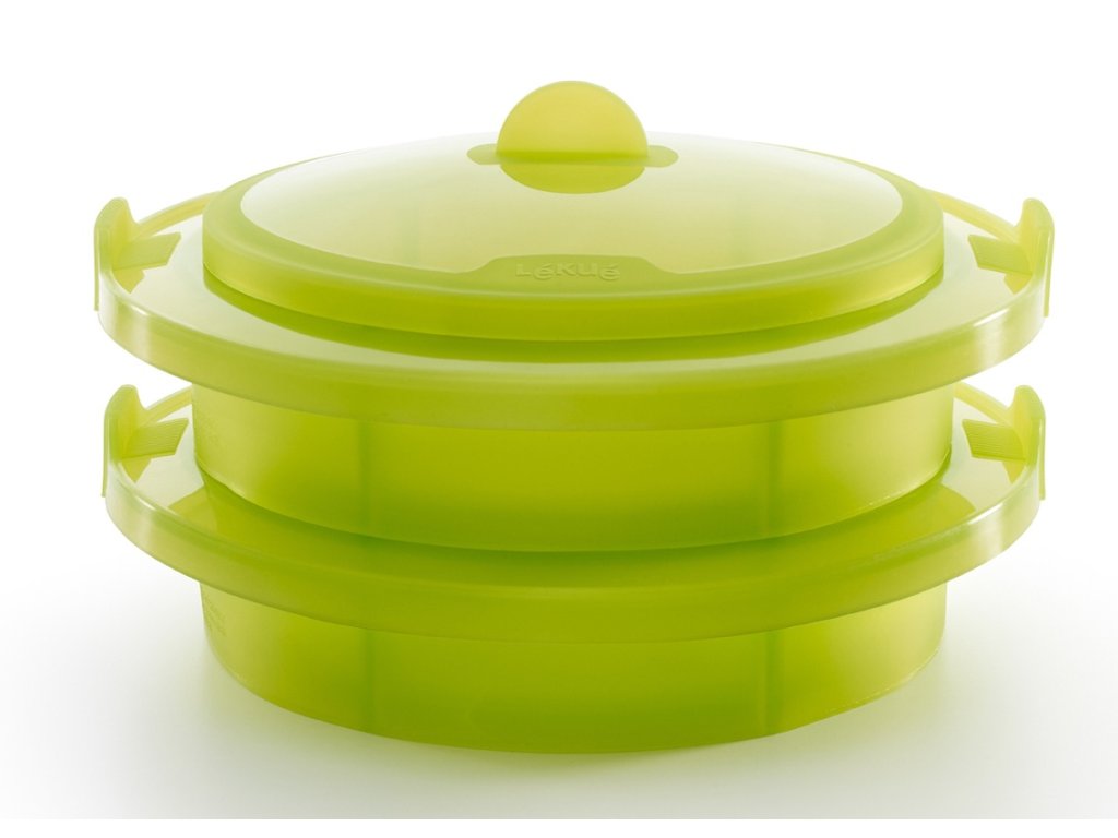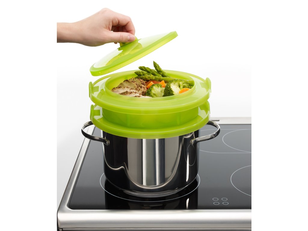 Silikónový naparovač s dvoma úrovňami. Jednoduchý a zdravý spôsob varenia rôznych jedál súčasne.