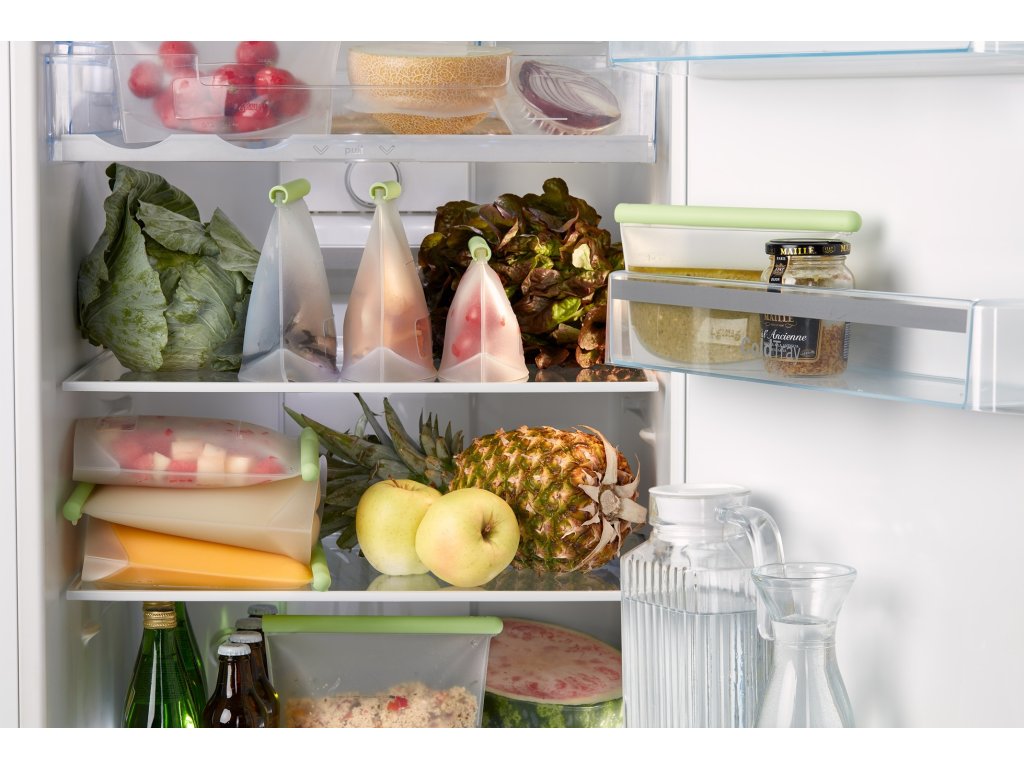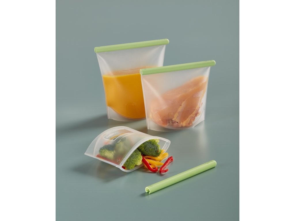 Silikónové vrecká na opakované použitie v 3 rôznych veľkostiach pre vzduchotesné skladovanie potravín (0,5 l + 1 l + 1,5 l). Ideálne na uchovávanie pevných i tekutých potravín v chladničke, mrazničke alebo na policiach.