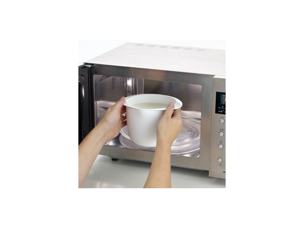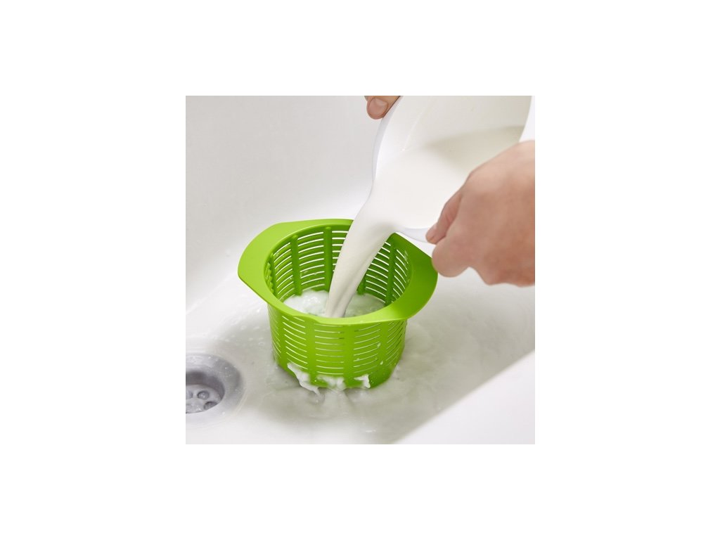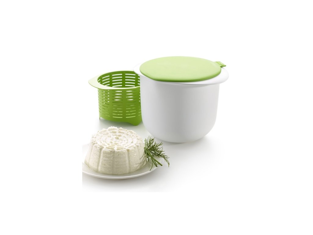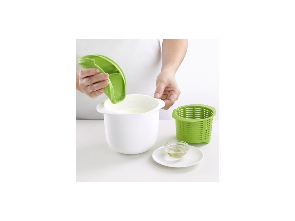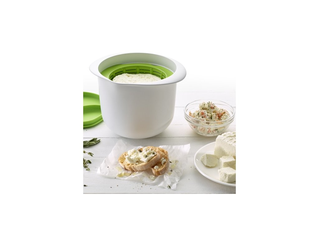 Výrobník syrov vám umožní vyrobiť čerstvý syr jednoduchým 15-minútovým procesom varenia a hodinou a pol odpočinku, a to vďaka svojim trom prvkom: miske na ohrev mlieka, veku s odmerkou kyseliny na naliatie a sitku, kde sa syr tvorí… rovnako kúzelné ako ľahké!
